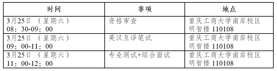 按教育部相关文件规定,资格审查在复试前进行。资格审查由各培养单位负责。各培养单位通知参加复试的考生提交以下材料,并在入学报到时提供材料原件以供查验。资格审查材料提交时间为3月25日上午8:30,提交地点为重庆工商大学南岸校区明智楼 110108。