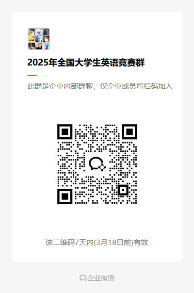 2025年全国大学生英语竞赛报名且缴费成功的学生信息已在企业微信2025年全国大学生英语竞赛群公布,请进入企业微信群查看核对报名参赛类别和所在校区信息是否有误,如果有误,请在3月13号前在企业微信联系王雪纯老师进行更正。