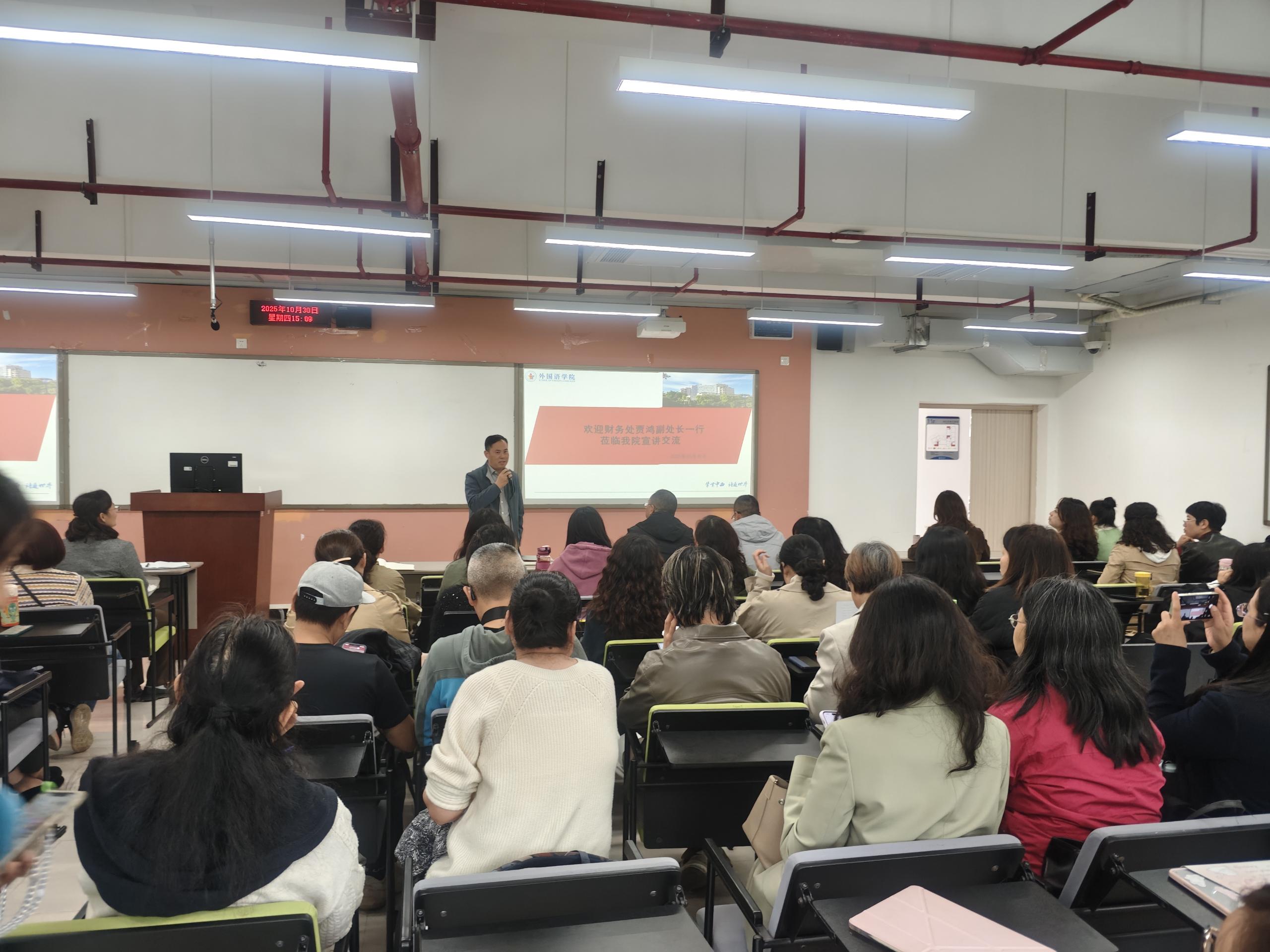 为解答教师在经费报销过程中的具体疑问,本次培训会特别邀请了学校财务处贾鸿副处长及相关工作人员一行莅临现场进行指导。贾鸿结合高校科研工作的特点,对科研经费的预算编制、支出范围、报销流程及常见风险点等关键问题进行了详尽解读。在随后的互动答疑环节,财务处专家们针对老师们提出的实际问题给予了专业、细致的解答,现场交流气氛热烈。