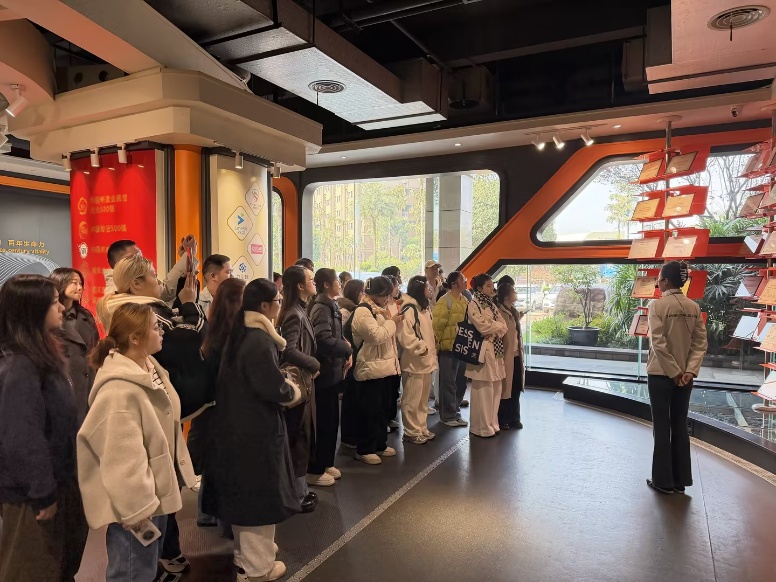 随后,师生一行来到集团展厅。展厅工作人员从企业初创的艰辛历程到如今的产业规模,从核心产品的迭代升级到全球布局的战略规划,展厅内的图文资料、实物展品及多媒体演示,全面展现了宗申集团的发展脉络与行业影响力。同学们认真聆听讲解,对企业“创新驱动、质量为先”的发展理念有了深刻理解,进一步明晰了行业发展趋势与人才需求方向。