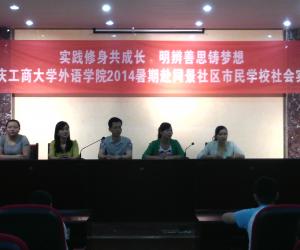 2014年6月25日9:00,外语学院2014“实践修身共成长,明辨善思铸梦想”暑期社会实践启动仪式在南岸区长生桥镇同景社区服务中心正式举行。出席本次启动仪式的嘉宾有长生桥镇同景社区党委文李燕书记、长生桥镇同景社区李小渝主任、长生桥镇同景社区市民学校负责人周欣老师、重庆工商大学外语学院副院长王恩科副教授、外语学院分团委书记冉永琴老师。