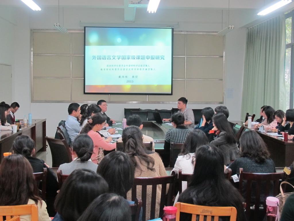 4月14日下午,国务院学位委员会外语学科评议组召集人、教育部社科委员会语言文学学部委员兼召集人、原上海外国语大学校长、博士生导师戴炜栋教授应邀来外语学院做了一场题为“外国语言文学国家级项目申报研究”的精彩讲座。外语学院40余位教师聆听了讲座。