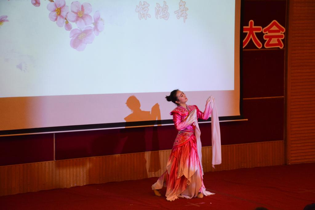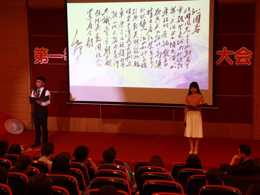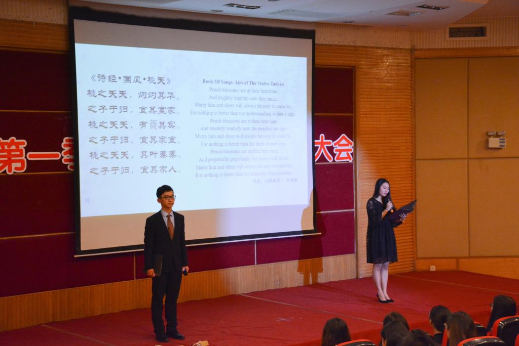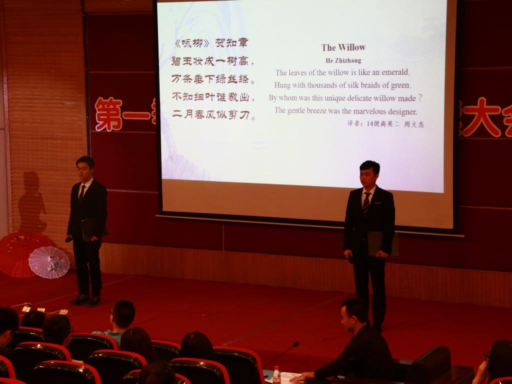时逢谷雨时节,译读大会在清代诗人、画家郑板桥“几枝新叶萧萧竹,数笔横皴淡淡波。正好清明连谷雨,一杯香茗坐其间” 的中英诗句中拉开序幕。同学们纷纷化身“朗读者”,为现场观众带来了中国经典诗词的中英文译读。李延年的《李延年歌》、王昌龄的《闺怨》、崔护的《题都城南庄》、贺知章的《咏柳》、《诗经•国风•桃夭》、顾城的《小巷》、毛泽东的《卜算子·咏梅》、王昌龄的《闺怨》等八篇经典古诗词中的名句被翻译成优美的英文,这些最熟悉、最打动人心的诗词,精彩独到的翻译,激发了现场观众共同的记忆与情怀,带领大家在“世界语言”中领会中国诗词的唯美。朗诵间隙,校大学生艺术团舞蹈分团成员、2016级商务英语专业的刘婷娴同学带来《惊鸿舞》,古典的音乐、柔美的舞姿把观众拉到了古风古韵的诗词世界。受《中国诗词大会》启发,译读大会现场还设置了精彩绝伦的“飞花令”环节,随机邀请现场同学两两一组“斗诗”,分别以“春”、“雨”、“花”为主题进行了三轮比拼,每组选手进行了至少六轮的PK,许多生僻的诗句他们都信手拈来,让人赞叹,对诗过程酣畅淋漓,现场观众拍手称快。译读大会还专门设置了向首位获国际翻译界最高奖项之一的“北极光”杰出文学翻译奖的亚洲人许渊冲老先生致敬的环节,两位同学声情并茂地朗读了毛泽东主席的作品《沁园春·雪》和许渊冲老先生的同名翻译作品,气势磅礴、震撼人心。
