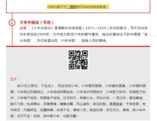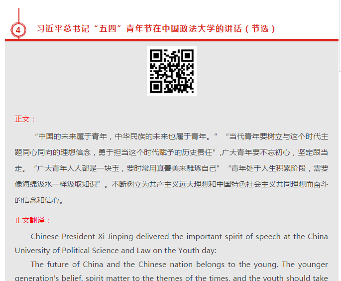 团日活动选取了《少年中国说》、毛泽东主席《唯心历史观的破产》文章节选、邓小平同志1979年改革开放之初的讲话、习近平总书记“五四”青年节在中国政法大学讲话、入团誓词等五段篇章,组织雷锋团支部成员在专业教师的指导下将节选内容翻译成英文,该支部成员纷纷化身“朗读者”,用中英双语对这五个选段进行了朗读,记录并呈现在外语学院分团委“工商外语人”微信公众号上。