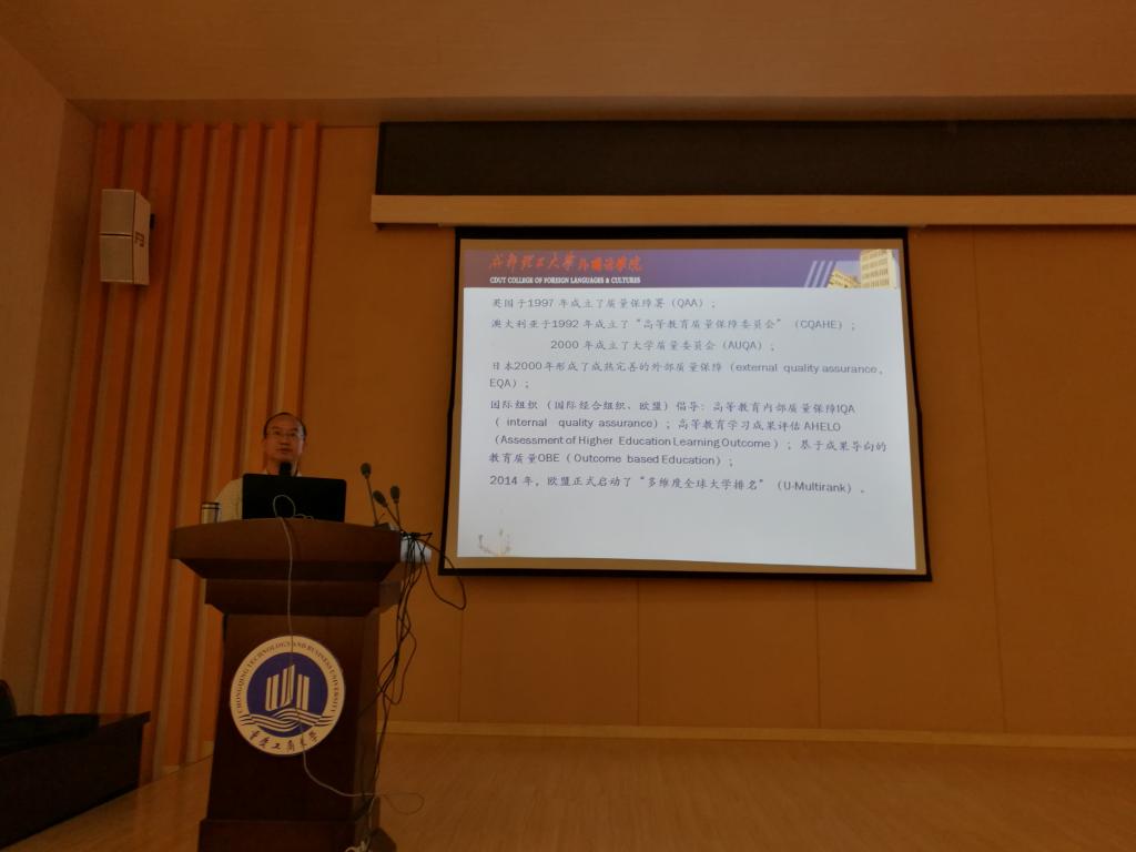 首先,成都理工大学外语学院院长段成教授进行了题为“牢记使命,常态迎评——进一步提高专业建设水平和人才培养”的讲座。段成教授系统阐释了对审核性评估的总体认识和对审核性评估指标的理解。以成都理工大学外语学院的评估经历为例,段成教授分享了成都理工大学从学校、学院、及教师个人层面如何进行迎评准备、如何应对评估的经验。