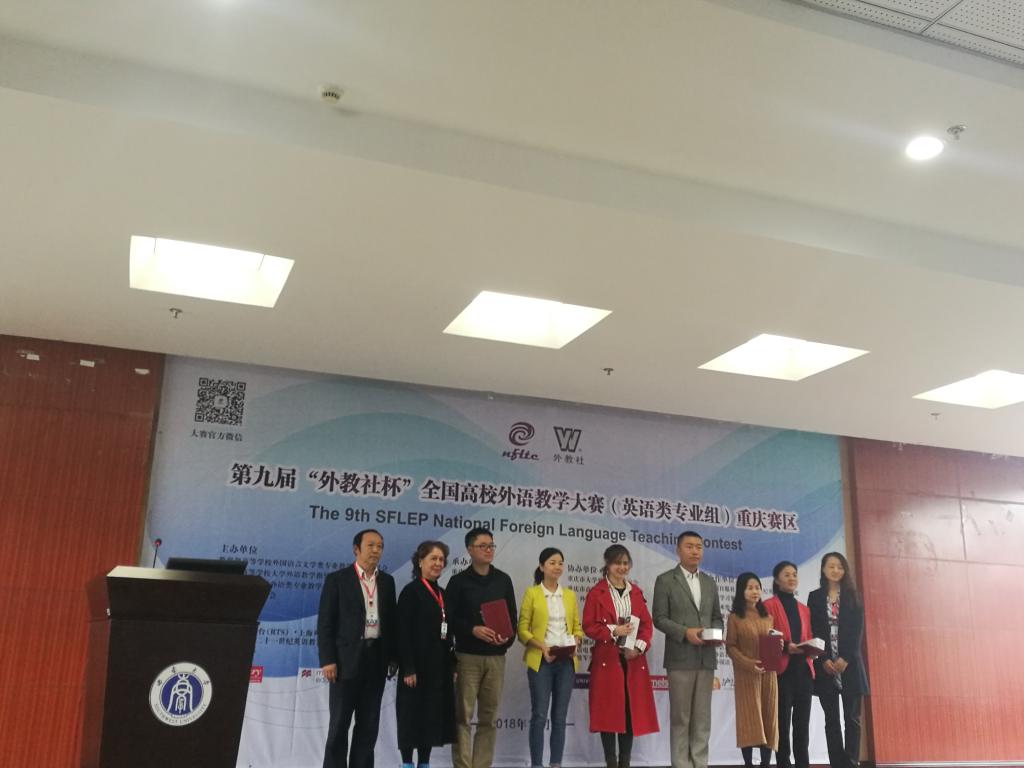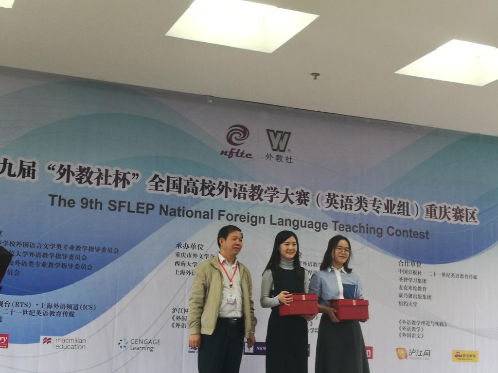 第九届“外教社杯”全国高校外语教学大赛(英语类专业组)重庆赛区复赛与决赛于10月13-14日在西南大学举行。我院选派张冉和张林玲两位老师参加比赛,与来自全市20余所高校的30余教师同场竞技。经过两天的激烈角逐,张冉老师获得此次教学大赛商务英语专业组一等奖,张林玲老师获得英语专业组二等奖。