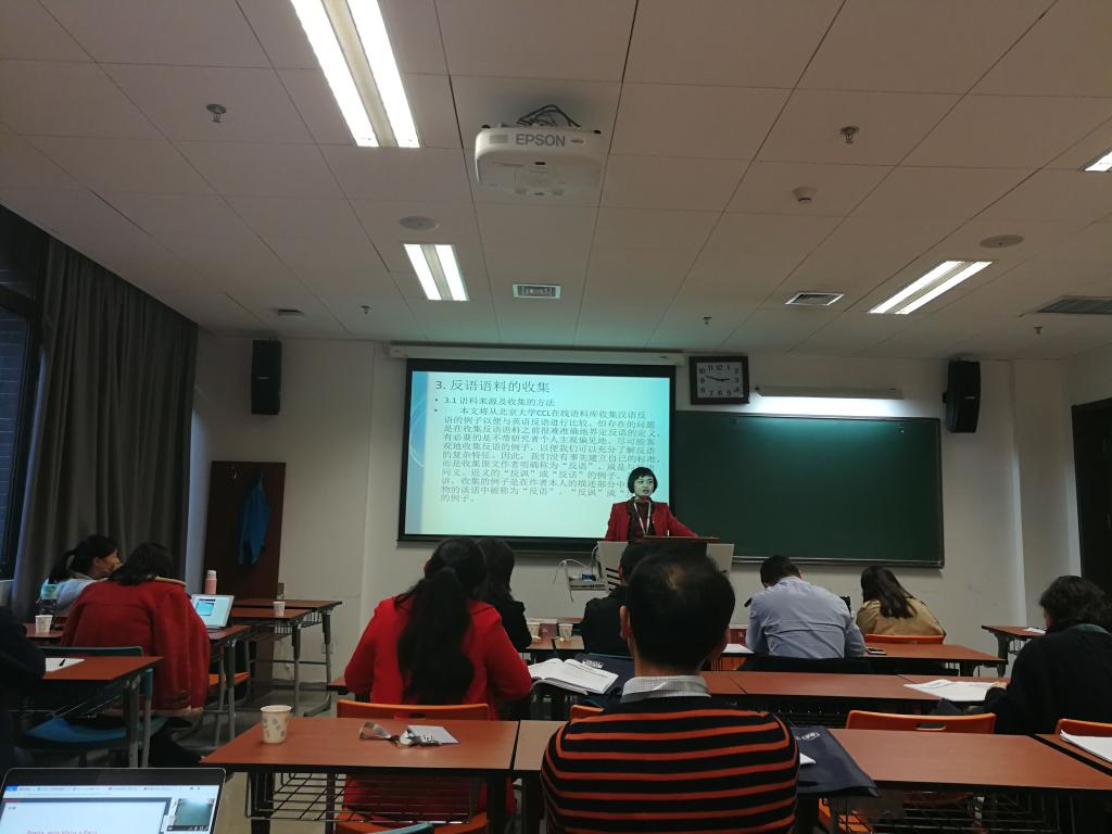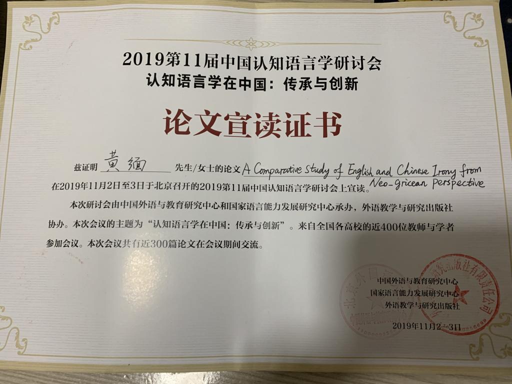 2019年11月2日,由中国外语与教育研究中心、国家语言能力发展研究中心承办,外语教学与研究出版社协办的第11届中国认知语言学研讨会(ccla 2019)在北京外国语大学召开,大会主题为“认知语言学在中国:传承与创新”。此次会议设有7场主旨发言、25个主题会场,来自世界各地的600多位学者参加了此次盛会。外语学院教授黄缅博士应大会组委会邀请参加了此次全国性会议,在大会上对中国社会科学院的方梅教授关于反问句和陈述疑问句的主旨发言进行了提问交流。此后,又在主题会场进行了题为A Comparative Study of English and Chinese Irony from Neo-gricean Perspective的讲座,并在发言后与参会的专家学者进行了讨论。