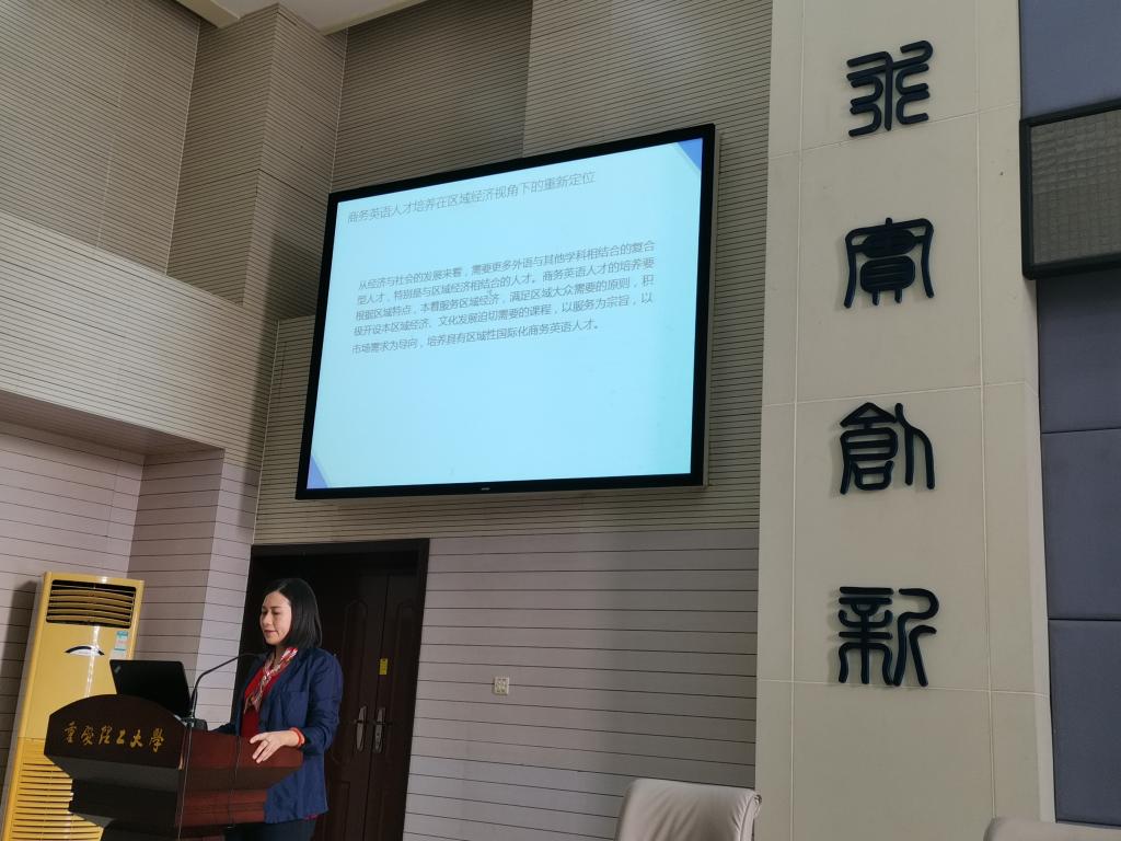 大会分为三项议程。第一项为主旨发言,专家们分别从政府、企业、高校的角度紧扣新文科背景下商务英语人才需求、人才培养模式、商务英语学科建设等方面高屋建瓴提出建设性对策。第二项议程为参观重庆理工大学工程训练与经管实验中心,观摩商务实践教学活动,让与会者对重庆理工大学2138CC太阳集团商务英语专业跨学科融合人才培养模式有了切身的体验和认识。第三项议程为小组研讨发言。邹莉老师代表重庆工商大学外语学院从跨学科的区域经济的商务英语人才培养视角进行了发言。