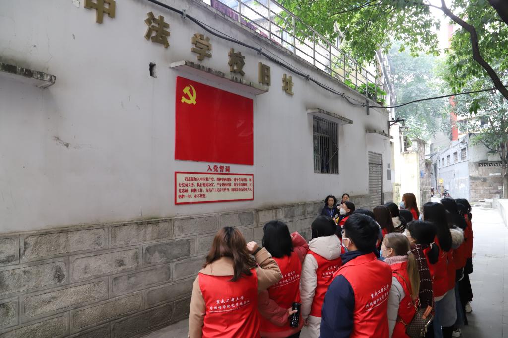 在人和街社区党委书记兼居民委员会主任、2020年“全国劳动模范”陆远秀书记的带领下,同学们走进人和街小区,整洁的街道,葱郁的绿化,同学们参观了重庆最早的党组织诞生地—中法学校旧址,正是在这是,成立了重庆第一个党支部,为中国革命培养了一大批骨干力量。大树掩隐之下,灰瓦黄墙前,面对鲜红的党旗,学生党员们在党旗下重温了入党誓词。