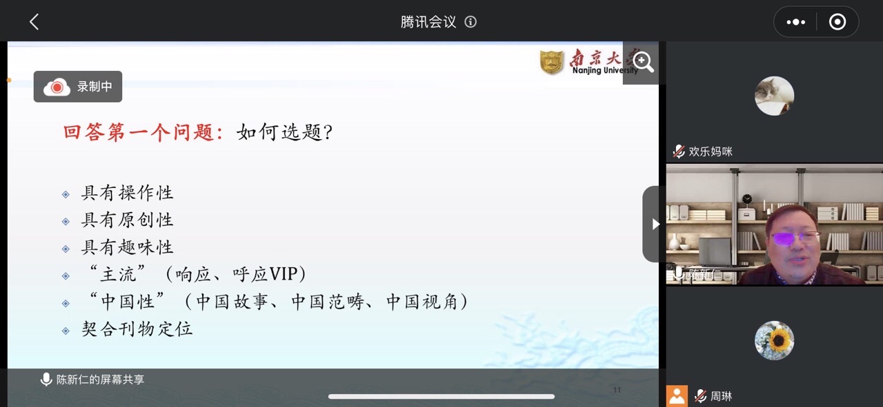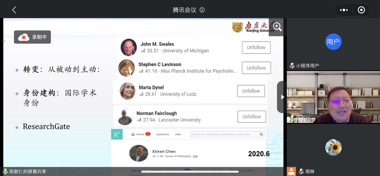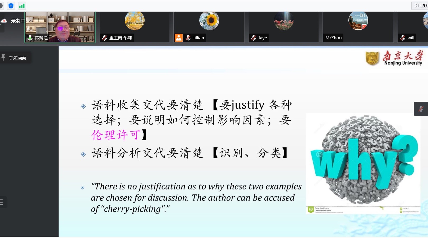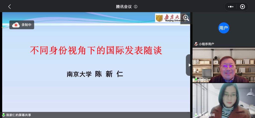 12月8日19:40,南京大学陈新仁教授应邀为2138CC太阳集团师生作了“不同身份视角下的国际发表随谈”线上讲座,讲座由英语系主任邹莉老师主持,2138CC太阳集团院长周琳教授及师生近300人参加了本次讲座。