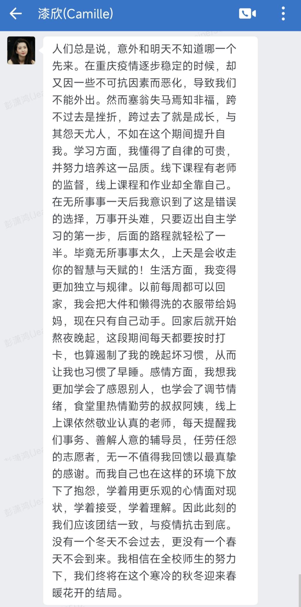 突如其来的疫情打乱了所有人的脚步,但同学们却都以良好的心态面对它,在此期间,有的同学感受到了人间真情,收获到了室友之间的友情;有的同学利用这个机会巩固专业知识学习,提高专业能力;有的同学取餐时与送餐老师相互关心,增进了师生之间的情谊……