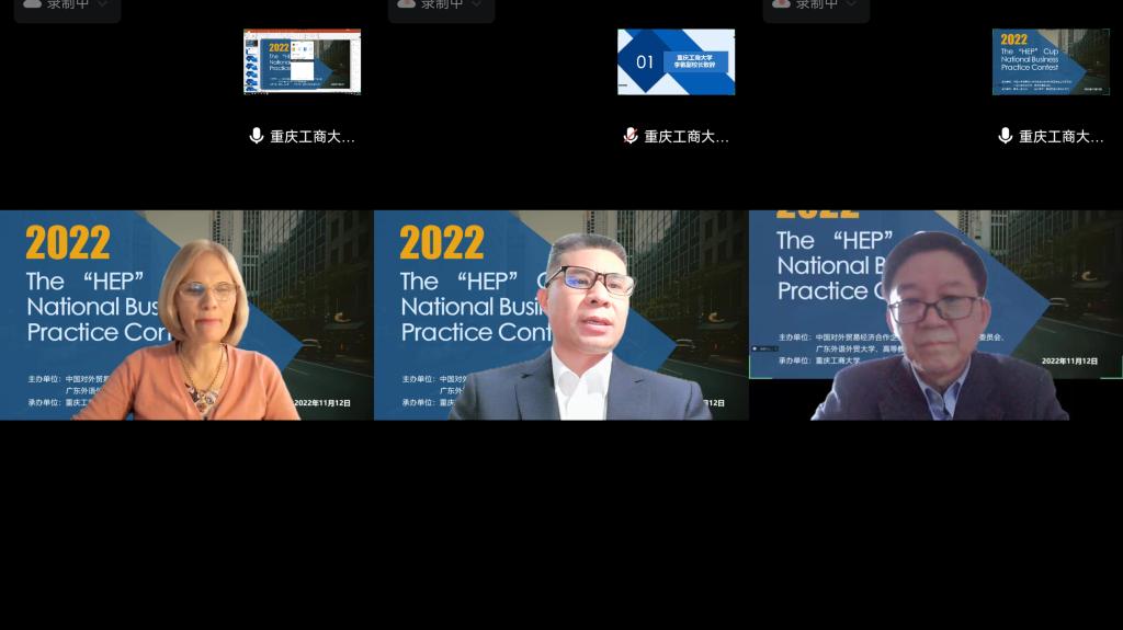 2022年11月12日下午,2022“高教社”杯全国商务英语实践大赛西南赛区区域赛在我校成功举办。大赛由中国对外贸易经济合作企业协会商务英语专业工作委员会、广东外语外贸大学、高等教育出版社主办,重庆工商大学承办,重庆市商务英语研究会协办。经过前期初赛,共有6支不同高校的团队进入本次西南赛区区域赛。结合当前疫情防控形势,本次比赛通过腾讯会议线上方式举行,1000余名来自国内各高校的师生在线观摩。