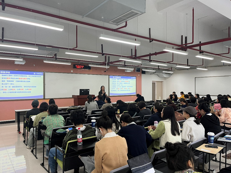 院长周琳围绕即将到来的新一轮教育教学审核评估进行了工作安排,带领教职工学习了评估手册,从指导思想、工作目标、基本原则等方面对新一轮审核评估进行了解读;同时从办学定位、教学资源、人才培养、专业特色等方面对学校和学院的基本情况进行了梳理。她强调,审核评估是对学院本科教育教学工作的一次重要检验,全院教职工要严肃教风学风,把好课堂教学关,确保各项评估任务按时、保质、高效完成。