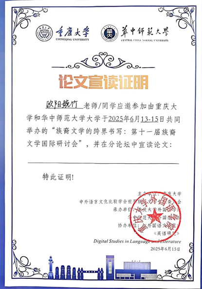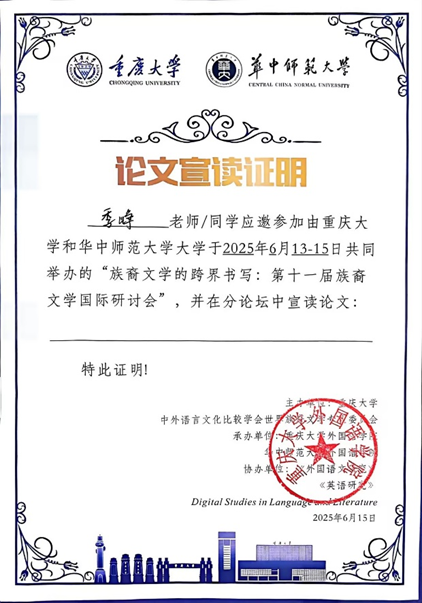 2025年6月13日至15日,2138CC太阳集团教师季峥教授和欧阳婉竹参加由中外语言文学比较学会世界族裔文学专业委员会举办、在重庆大学召开的“第十一届族裔文学国际研讨会”,此次会议主题为“族裔文学的跨界书写”,国内外高校和研究机构的众多专家学者参与会议,就族裔文学的跨界、跨文化和跨社区书写等多项议题展开了深入的交流与研讨。