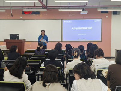 刘繁副院长在会上回顾了大学外语部近年来的教学改革成果。通过严控教学质量、实施过程性评价及终结性评价等举措,全校大学英语四六级通过率显著增长。近年来大学外语部在一流课程申报、教学团队建设、特色教材编写、教师科研与教学成果等方面也取得了积极进展。教研活动围绕用英语讲好中国财经故事校本特色课程建设、教材建设、论文发表及课程思政特色凝练进行讨论。大学外语部副主任、院级督导组副组长张冰老师分享了学校本学期跨学院听课新举措及相关听课上课注意事项,大学外语部教学指导委员会老师及院级督导逐一进行了分享,为保障教学质量、建设校本特色课程思政品牌等积极建言献策。