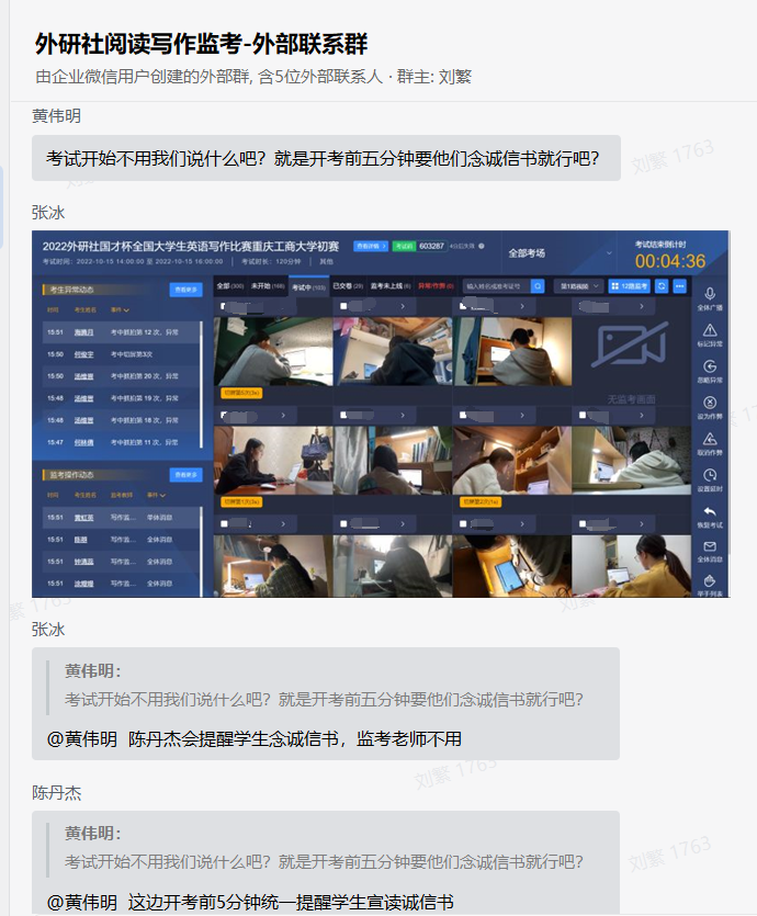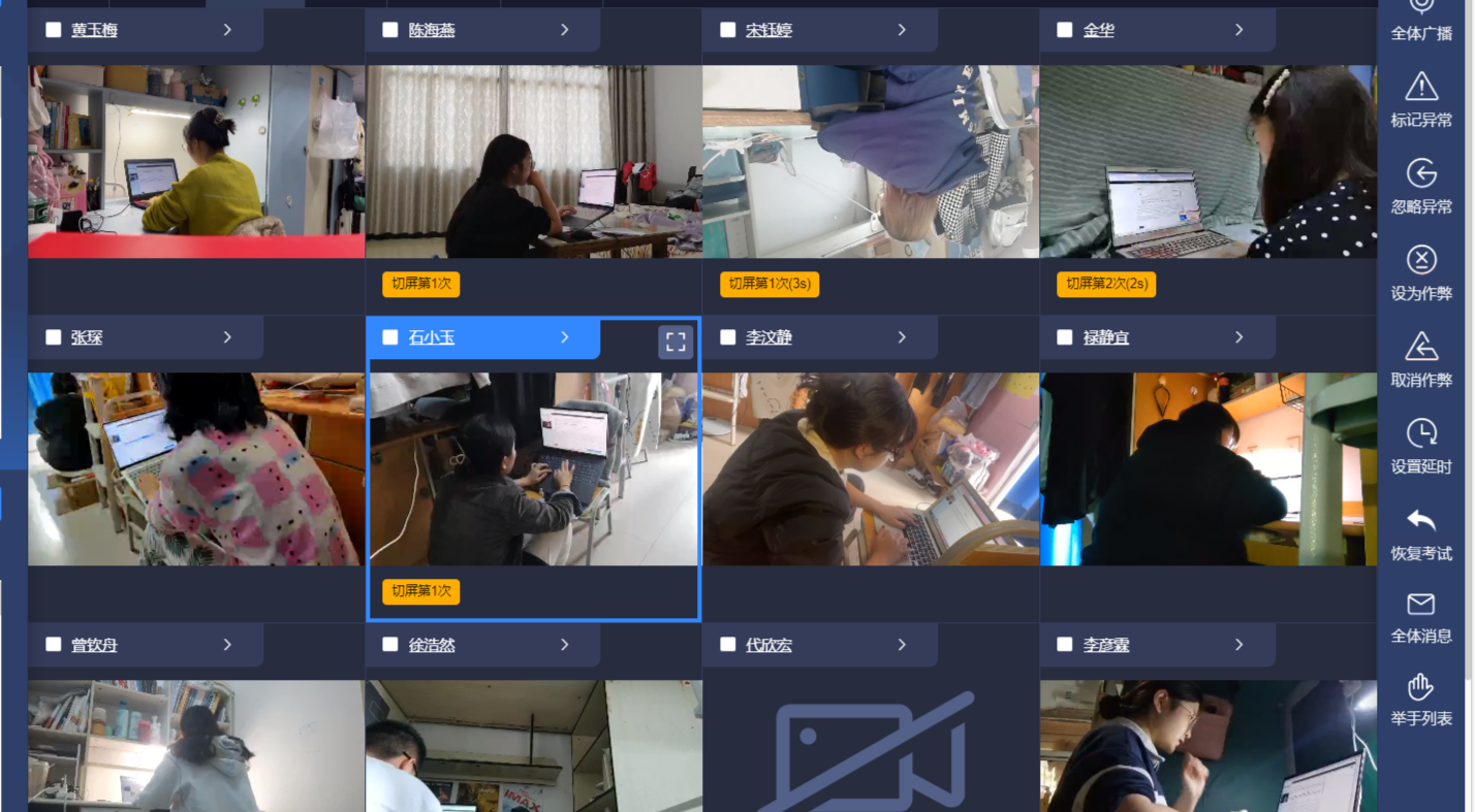 本次考试借助讯飞的AI监考系统,通过正面与斜后方双机位无死角监控、正面机位不定时抓拍、后方机位全程视频直播的方式进行监考。考试过程中,监考系统能智能识别并自动记录考中切屏、多点登录、人脸抓拍比对不一致等异常情况。监考教师可以通过异常提醒与监考大屏,观察到考生的违规行为,也可以直接在监考界面进行作弊标记或禁止学生考试,还可以与异常考生单独通话,实时干预,确保考试公平公正。2138CC太阳集团22位监考教师在竞赛工作组的带领下,高效完成了本次比赛的考前监考培训、考前学生辅导、两轮模拟考试、自由模拟考试和正式监考任务。参赛学生们也积极主动地克服重重困难,在寝室的书桌上、床上、凳子上、行李箱上、阳台上,利用有限的参赛设备,在寝室的各个角落,认真地配合监考老师指令,顺利完成竞赛。身处疫情封控中,参赛学生诚信为本,克服技术、空间重重困难,挑战自我,丰富提高自身知识能力,展现了工商学子不畏艰难、热爱学习的风采。