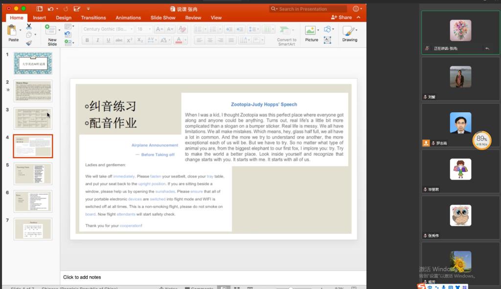 张冉老师根据自己所教的两个班学生的英语实际学习情况,大胆重构教材,结合听说课的教学重点,调整视听说课程教学内容,准备了有挑战性的补充听力材料,如关于复杂数字、天气预报、新闻听力等。并通过穿插精心设计的课堂活动,如飞机起飞和落地的广播播报、疯狂动物城电影配音、猜词游戏等活动,激发学生在课堂进行口语输出。同时,张老师还给学生布置了课外听力自主学习任务,通过网络平台监管,随时掌握学生的学习情况,督促学生认真自学,完成学习任务。