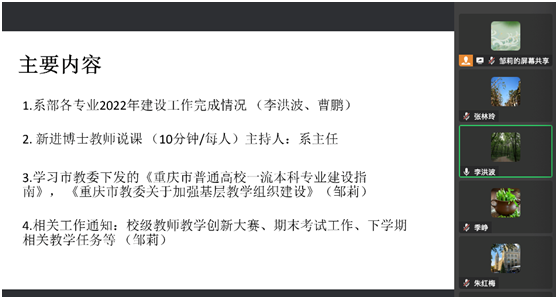 在邹莉副院长领学下,全体与会人员共同学习了重庆市教委下发的《重庆市普通高校一流本科专业建设指南》和《重庆市教委关于加强基层教学组织建设》等文件,明确了切实提高学院教师教学水平和提升人才培养质量的目标。最后,邹莉介绍了学院即将开展的相关工作,包括组织教师参加校级教师教学创新大赛、完成市级一流本科专业建设总结、明确毕业论文阶段性工作、新学期教学任务安排以及有序推进“三进”工作等。本次教研活动为进一步加强学院在新一年的专业课程建设和深入开展教学改革起到了积极的推动作用。