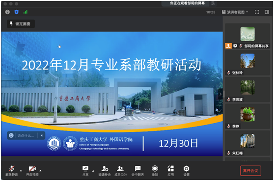 首先,英语系系主任李洪波教授和法语系系主任曹鹏副教授分别介绍了系部各专业2022年工作完成情况,包括本科教学工作、学院在科研与创新发展以及学院研修活动开展等方面,特别是就基层教学组织建设、学院微专业建设以及学院科研团队建设的情况进行了详细说明。