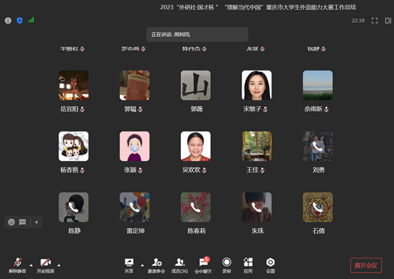 会议的第二个议程为本次比赛组织竞赛和指导竞赛的老师们分享心得。周利民老师首先分享了组织校赛以及准备市赛的过程和具体情况,法语系的周渝老师分享了法语系的竞赛准备情况和经验,主要在于平时教学中“盘活”教材,在课堂教学中有机融入《习近平谈治国理政》多语种版本、党的二十大报告多语种版本、“理解当代中国”多语种系列课程等材料,通过课堂讨论、汇报、主题班会、小项目等方式让同学们多角度深入学习相关时政文献。指导演讲、写作、阅读、笔译、口译的老师们各自分享了指导学生的心得,也为以后可以更好的帮助学生备赛提供了宝贵的经验。