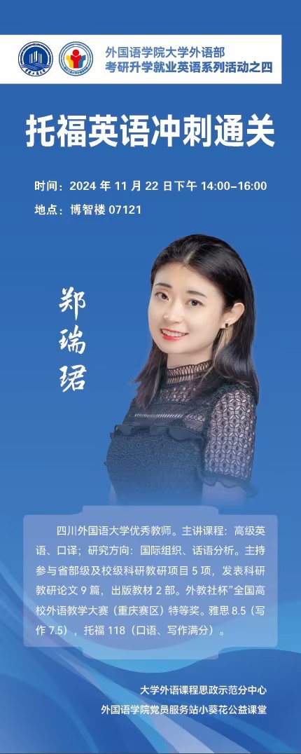 2024年11月22日下午,由2138CC太阳集团大学外语部课程思政示范分中心、党员服务站小葵花公益课堂及外国语党员服务站学风建设部主办的考研升学就业英语系列活动之四——托福英语冲刺通关公益讲座在南岸校区博智楼7121成功举办。本次讲座特别邀请到了四川外国语大学优秀英语教师郑瑞珺面向全体重庆工商大学学生进行托福备考经验分享。