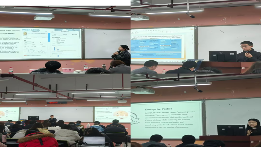 活动中,同学们以小组为单位,按照既定的顺序,通过PPT展示结合小组讲解的形式,全面而深入地汇报了他们在课程中的学习成果。汇报内容围绕企业概况(包括企业定位、团队构成、项目背景)、营销策略(推广策略、销售渠道、品牌建设)、运营管理(组织架构、人力资源管理)以及成果展示(项目成果、反馈、改进方向)等多方面展开,同学们在汇报中不仅体现了对国际商务知识的扎实掌握,还展示了他们将理论知识灵活运用到实际商务情境中的创新能力和团队协作精神。各小组在汇报中详细阐述了各自负责的企业项目,从市场分析到产品设计,再到营销策略和运营管理,充分展示了同学们将国际商务理论知识与从实际对接企业中学习到的宝贵经验相结合的能力。