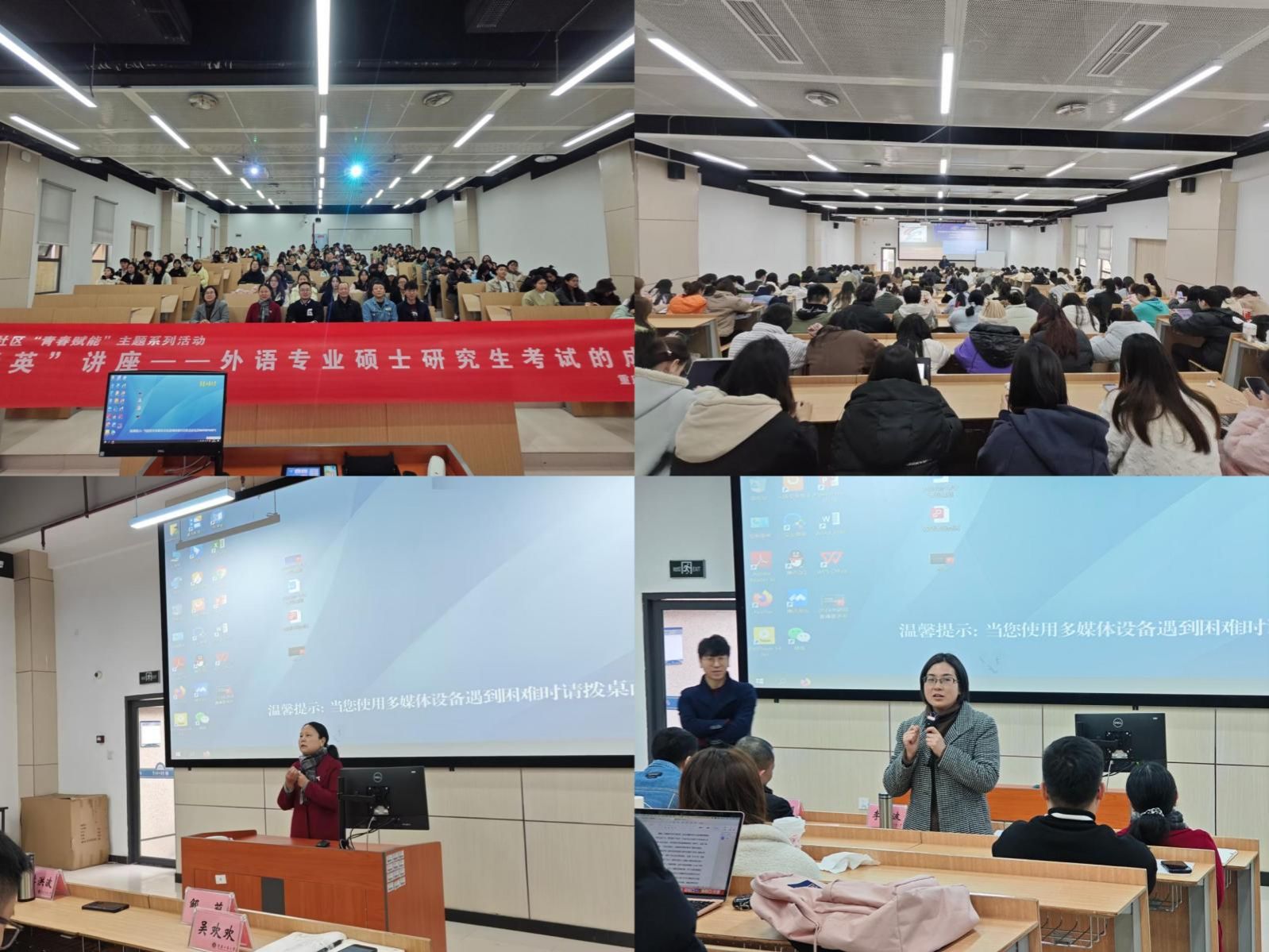 在第二阶段,赵昌汉教授以“外语专业硕士研究生考试的成功跨越”为主题进行了分享,主要包括三个问题:一、为什么要考研?二、考哪些专业?三、如何成功跨考?赵教授首先阐述了考研的动因,指出在当今时代背景下,考研不仅是时代的要求,更是时代赋予的机遇。接着,赵教授介绍了考研的专业方向选择。他强调,同学们既可以选择继续深造本专业,也可以勇敢地尝试跨专业备考。最后,赵教授就如何成功跨考给出了详尽的指导。他强调,考前务必做好充分准备,要对目标学校进行深入调研,并举例说明了调研的重要性和具体方法。考中则要保持良好的心态,充分发挥自己的优势。通过赵教授的讲解,同学们对考研有了更全面、更深入的认识,也为自己的未来规划提供了有益的参考。