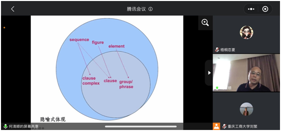 互动交流环节,何教授与线上广大师生围绕Excel表格如何计算R值、人际隐喻与言语行为理论之间的关系、转喻与隐喻关系、语义与语法之间的张力等话题展开讨论。何教授的讲座进一步加深了老师、同学们对英语情态人际隐喻的理解,为学院学科、专业建设提供了新的视角。
