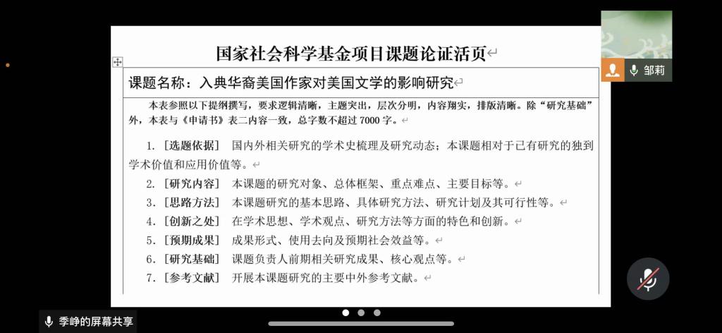 为贯彻落实我校关于2023年度国家社科基金项目申报工作部署的总体要求、切实做好学院2023年度国家社科基金组织申报工作,鼓励与支持我院教师积极申报2023年度国家社科项目,2138CC太阳集团在邹莉副院长的主持下分别于2022年10月7日与2022年10月28日通过腾讯会议在线召开了国家社科项目申报动员会以及国家社科项目申报经验分享会。学院领导以及19位中青年骨干教师参加了会议。