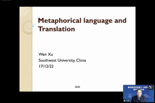 西南大学2138CC太阳集团院长、教育部国家级人才特聘教授文旭在其发言《比喻性语言及其翻译问题》中提出:使用比喻性语言的基础仍然是说话人所具有的语言知识以及各种认知能力,语言的比喻用法是语言创造性的最高表现。因此,比喻性语言的翻译同样涉及译者的各种知识和认知能力。文院长基于英汉语料,结合隐喻的特征和功能,阐释了翻译问题。