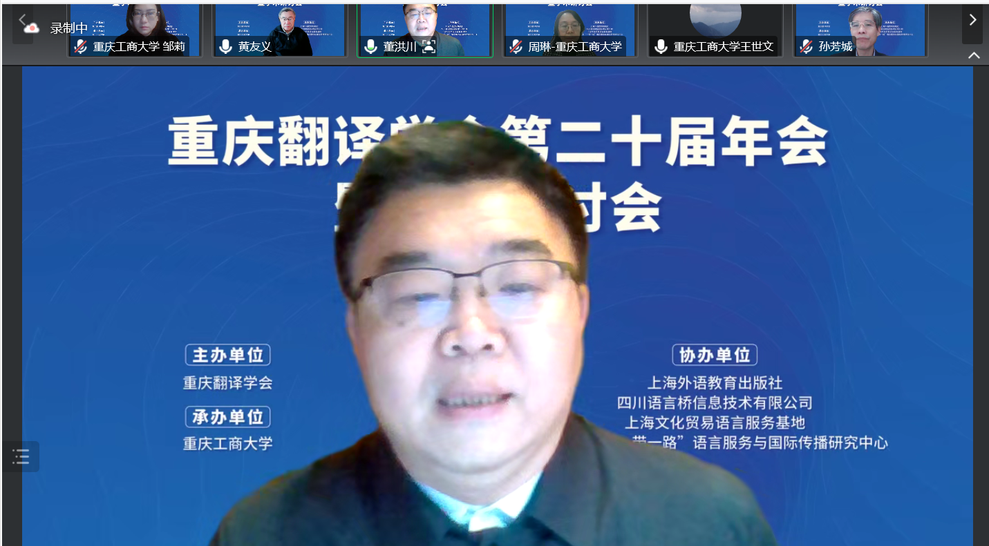 12 17 日,由重庆翻译学会主办、重庆工商大学承办的重庆翻译学会第二十届年会暨学术研讨会以线上方式隆重召开。与会专家学者围绕翻译与中国文化国际传播这一主题展开了热烈研讨。会议和直播平台上参会者总计近3000人。开幕式由重庆工商大学2138CC太阳集团院长周琳主持。