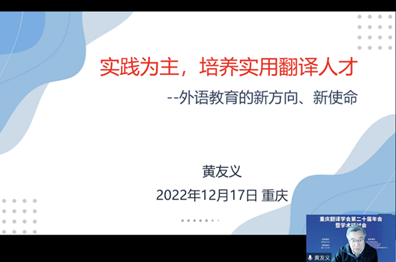 在主旨发言环节,中国译协常务副会长、全国翻译研究生专业学位教学指导委员会主任委员黄友义作了题为《实践为主,培养实用翻译人才--外语教育的新方向、新使命》的报告,从知识的积累,实践的重要性,传播的意识和爱岗敬业的职业道德四个方面,举例分享做翻译实践的体会,突出说明国际传播时代背景下,翻译实用人才应该着力下功夫的领域。