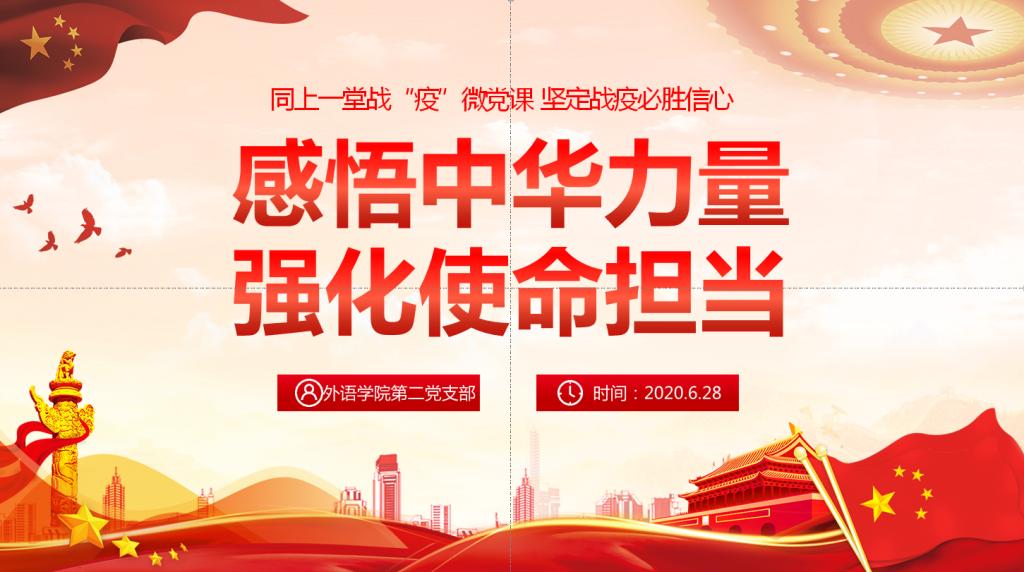 根据我校《关于开展基层党组织常态化疫情防控“四个一”行动暨“党课开讲啦”活动的通知》,6月28日外语学院党总支面向学院全体党员和各党支部组织开展了专题微党课、“党课开讲啦”活动。