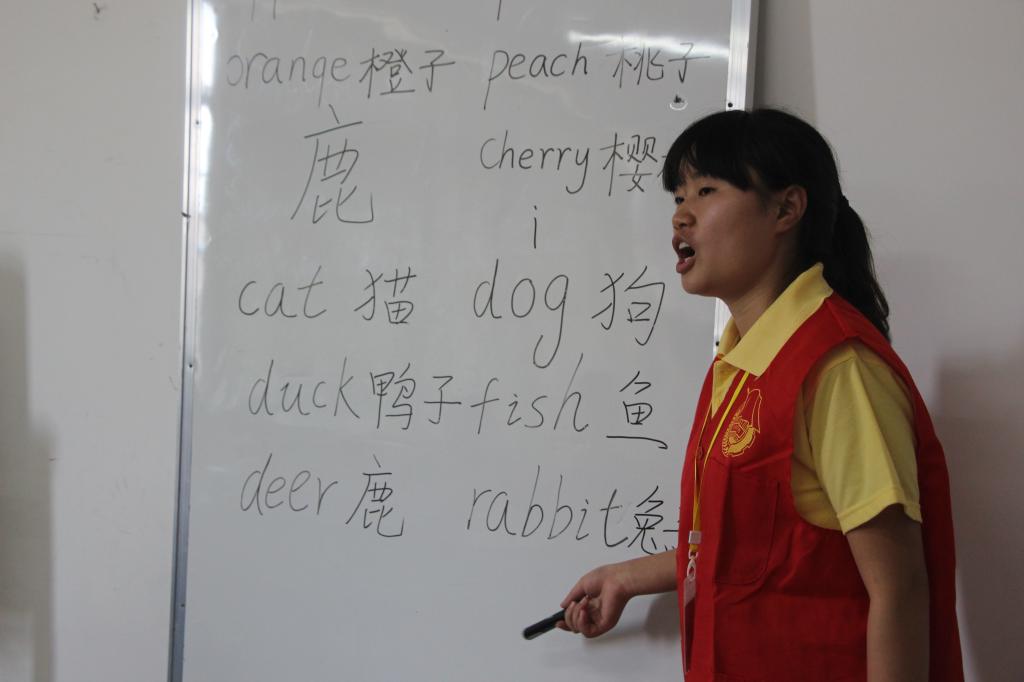“刚进教室的那一刻我其实被吓到了,”讲授第一堂英语课的刘昊同学这样说道,“后排整整齐齐的坐着高年级的同学,前排一二年级甚至连幼儿园的孩子都有。”看到了这样的情况,他立刻调整了授课内容,将一节课分前后两段进行,课程前半段增授基础英语知识,高年级的同学可以对低年级的孩子们进行帮扶;后半段则讲授一些交际用语,会有其他实践队员进入同学中进行详细辅导。