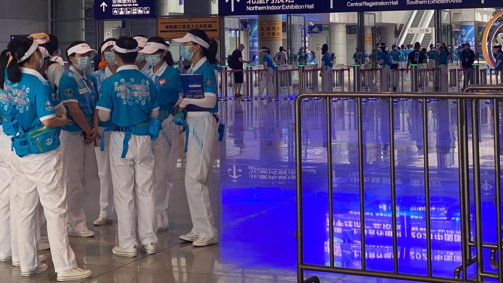 重庆工商大学2138CC太阳集团的志愿者分为展览组和峰会组两个组别。在重庆国际博览中心北广场及登陆厅,王仁伟等8名志愿者在服务台内工作,为来宾提供问询,引导等工作,方便来宾快速找到目的地;在北登录厅外广场入口,鲜雨佳等9名志愿者各自坚守岗位,配合疫情防控工作,主要提醒未入场的来宾准备好身份证,渝康码和行程码等重要证件,让大家有序进场;峰会组的志愿者陈则安则主要协助维护开幕式及闭幕式嘉宾进场秩序。