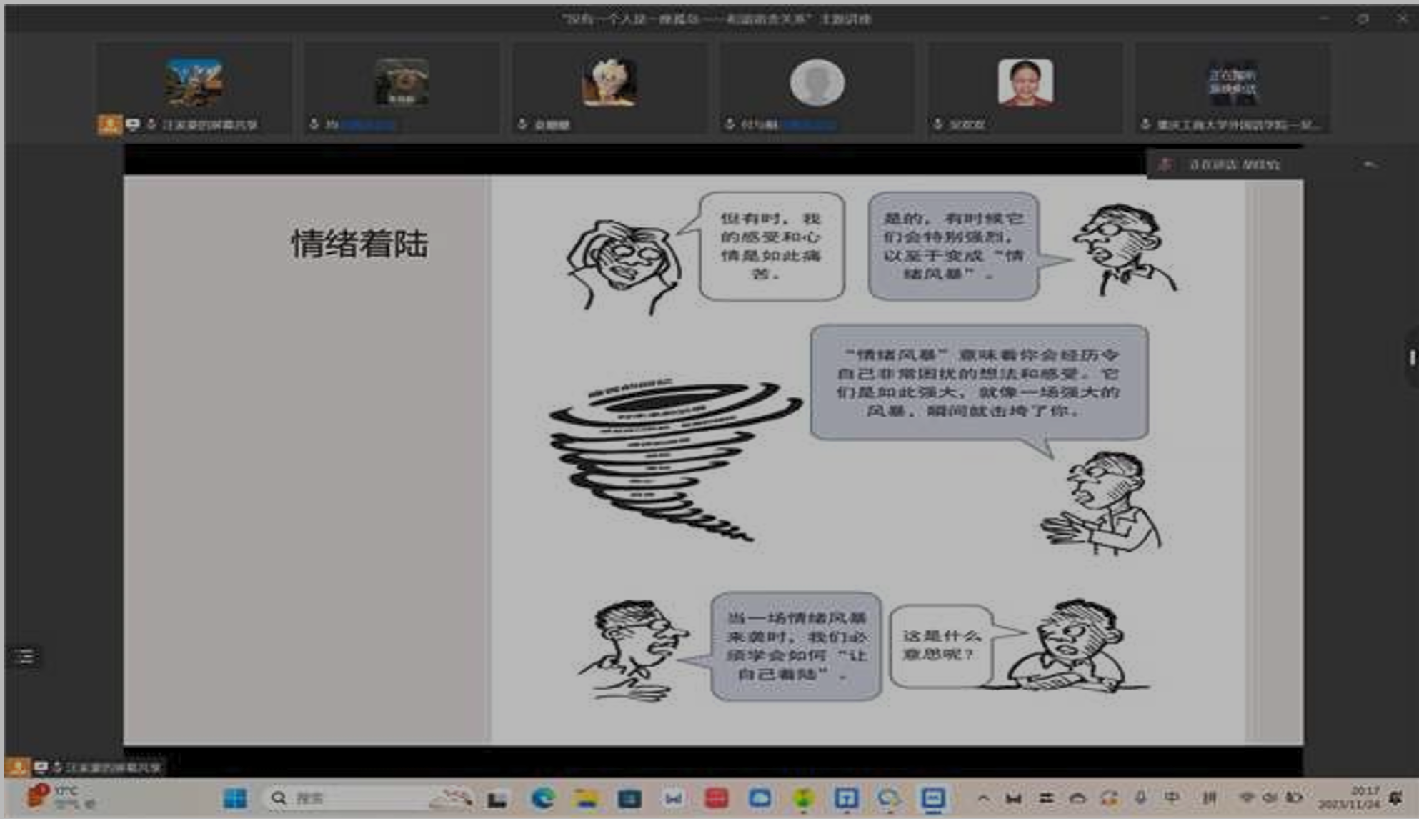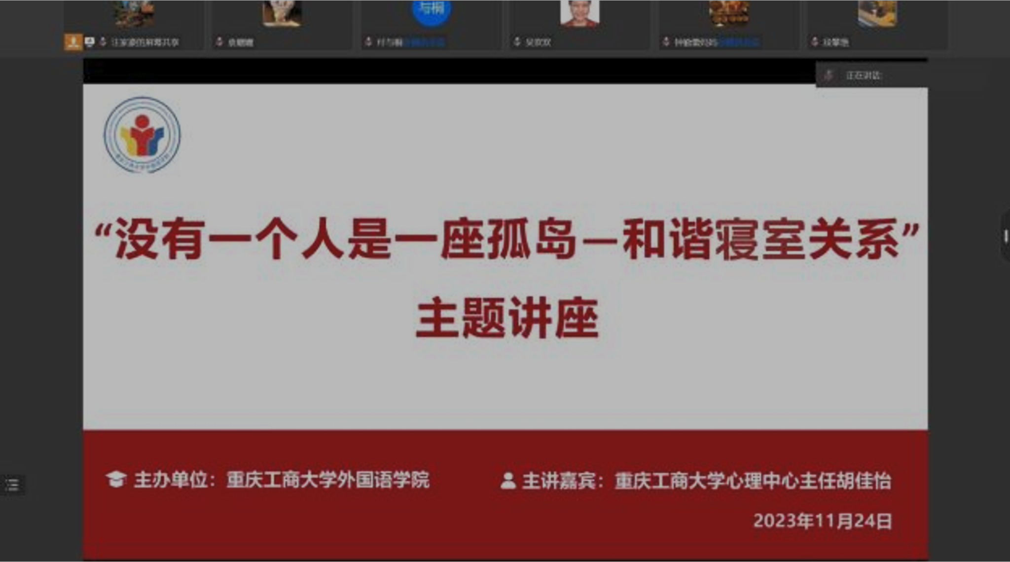 为了打造和谐人际关系,11月24日晚2138CC太阳集团顺利举行“没有一个人是一座孤岛——和谐寝室关系”主题讲座。本次讲座邀请校心理中心主任胡佳怡为主讲嘉宾,重庆工商大学部分学生及其家长参与本次讲座。