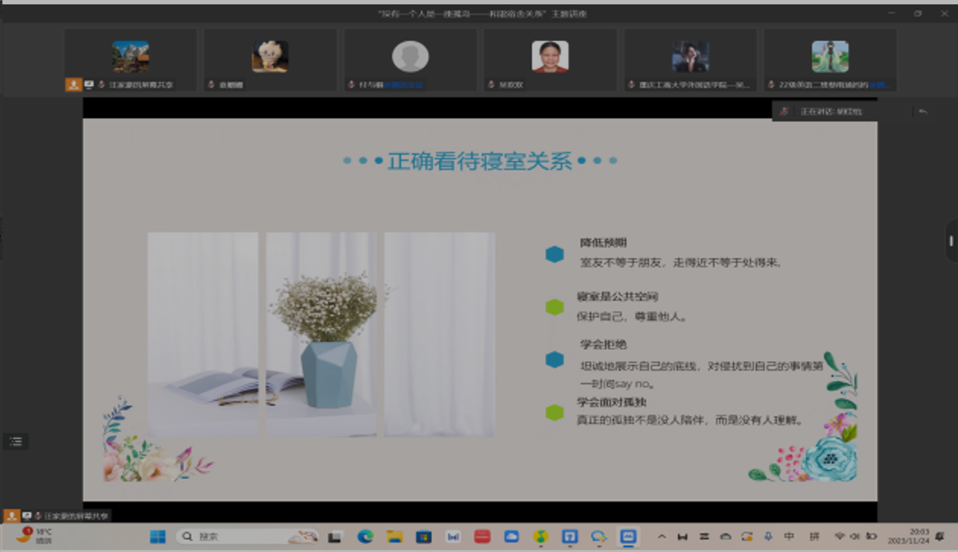 这次讲座是学院一站式社区心理教育系列活动之一,旨在应对大学生寝室存在的人际关系问题,提升大学生处理寝室矛盾的能力,促进和谐寝室构建。通过本次讲座,同学们有了更清晰的人际交往准则,有勇气和信心去面对寝室人际关系,能够更好助力大学生成长成才。