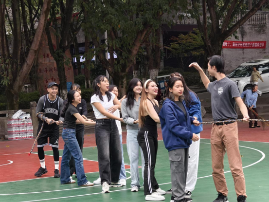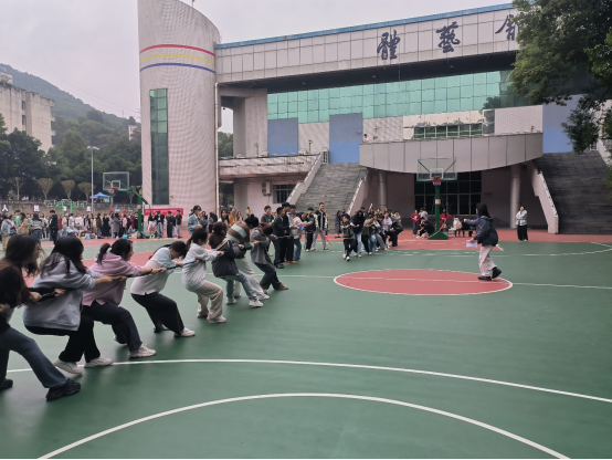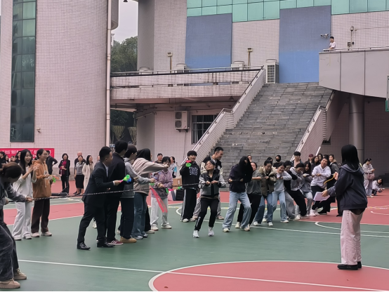 拔河比赛共分为四轮。比赛采用分组淘汰制,通过抽签的形式进行分组。各参赛队伍在比赛中展现出了顽强拼搏的精神风貌。随着裁判员的一声哨响,比赛正式开始。两边的队伍迅速进入状态,队员们双手紧紧抓住麻绳,身体后倾,双脚用力蹬地,麻绳一刹那在两队之间被拉得笔直。场外的同学也不甘示弱,他们呐喊助威的声音此起彼伏,“加油!加油!”的呼喊声响彻整个篮球场。在激烈的比赛中,有的队伍一开始就发起猛攻,试图速战速决;而有的队伍则稳扎稳打,依靠团队的节奏和力量逐步取得优势。每一次的僵持不下,每一次的绝地反击,都让观众们的心提到了嗓子眼。其中23法语一班和22商务英语一班的对决尤为精彩。两支队伍实力相当,比赛开始后,双方僵持了很久,队员们的脸都涨得通红,汗水不停地从额头滑落,但他们的眼神中却透着坚定。在经过长时间的胶着后,22商务英语一班凭借着强大的耐力和团队默契,骤然发力,一举赢得了这场关键的比赛,现场顿时爆发出雷鸣般的掌声。每轮比赛结束后,由出席的领导宣布晋级的队伍并给予鼓励!