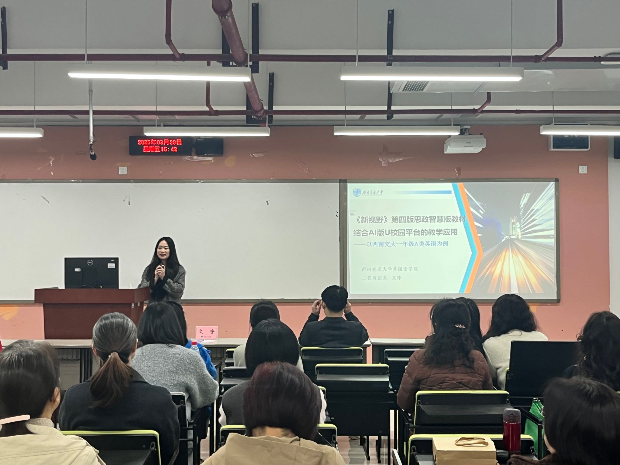 随后,大学外语部邀请西南交通大学文净老师作题为“新视野第四版教材结合AI版U校园平台的教学应用”专题讲座。文净老师从西南交通大学英语课程培养方案切入,系统解析了U校园AI平台在辅助教学教研、智能规划作业及多维评价体系中的应用。互动环节,文净老师与大学外语部教师进一步探讨了AI技术优化课堂互动、提升教学效率的路径。