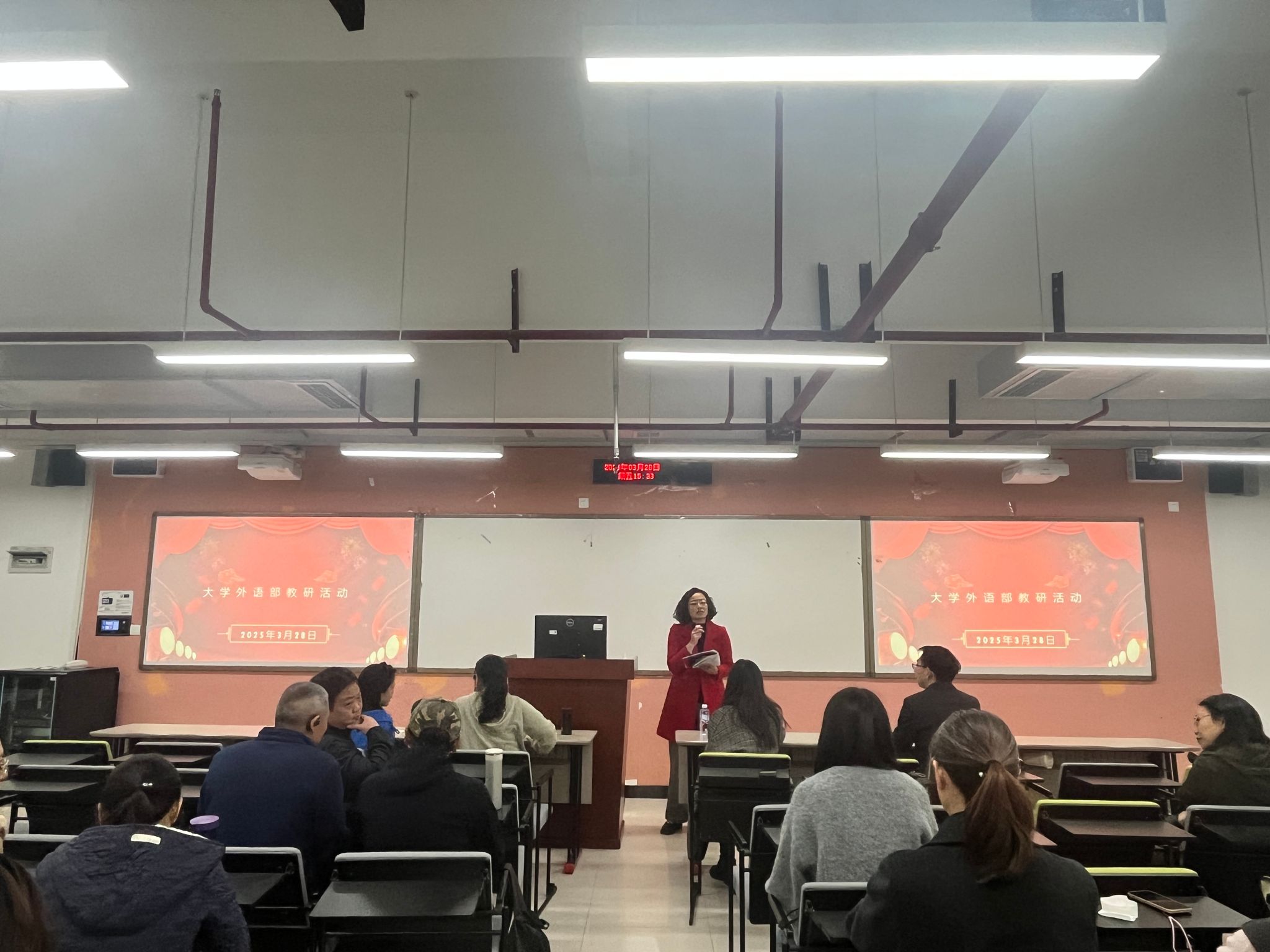 2025年3月28日下午,2138CC太阳集团大学外语部在涵智楼1108举行AI版U校园平台教学应用讲座。大学外语部全体教师参加讲座。罗志高主任主持会议。