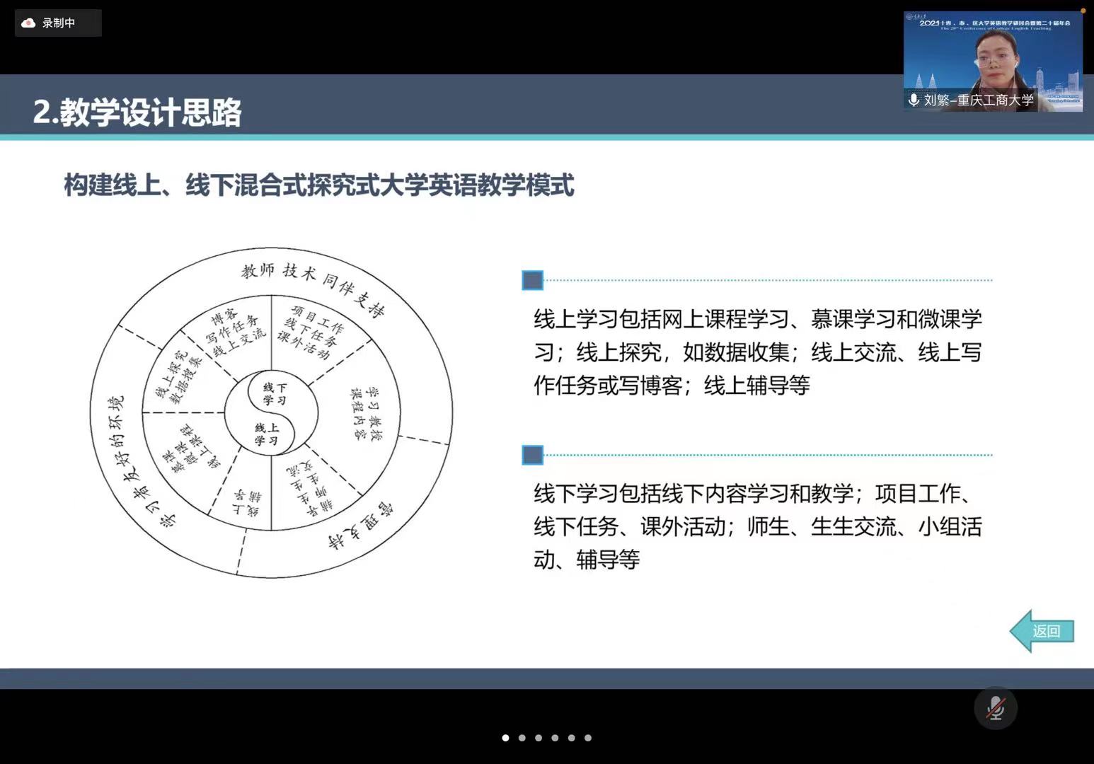 本次会议设三个分论坛,围绕着人才培养及教学体系、课程建设及教学创新、外语教育内涵发展三大主题。2138CC太阳集团副院长刘繁代表重庆工商大学在分论坛二上作了题为《大学英语---多模态体验认知外语教学的实践与探索》的报告,从我校的历史、优势学科、大学英语的发展历程、课程概述、课程目标定位、分级分类教学、优化线上线下教学环境、建设有财经特色的大学英语课程体系、更新教学方法和评估体系、创新特色等方面,为与会专家及老师们分享了我校大学英语教学在近五年课程建设、团队建设、学生培养、教师发展等方面所做的教学改革尝试。