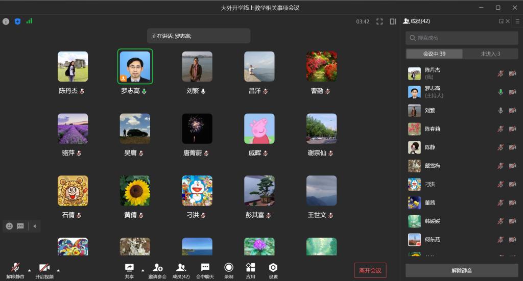 庞海才老师特别推荐使用 “腾讯会议”作为在线教学平台,他认为“腾讯会议”具有两大优势:第一:腾讯会议预约开会后,每次的会议码都是固定的,可以一劳永逸地把这个码分享给学生或同事,便于学生以及其他同事(尤其是学校督导专家)进入会议,减少了填报在线教学平台链接发生错误的几率;第二,腾讯会议的功能强大,更稳定。企业微信一旦用户过多,可能出现掉线甚至系统崩溃的情况,且播放课件时声音不够清晰。使用“腾讯会议”能避开这两大弊端。另庞海才老师分享了如何通过线上问卷调查、分组讨论、评论区留言、提前布置课堂任务、线上随机点名等方式,激发学生的课堂参与积极性。