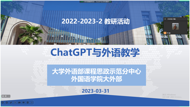2023年3月31日下午,2138CC太阳集团大学外语部开展了主题为“ChatGPT与外语教学”的教研活动。此次活动的主讲人是我校人工智能学院杨艺教授。
