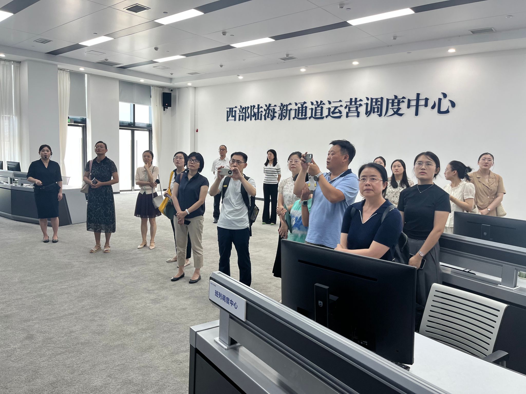 在刘梦骥总经理助理的陪同下,调研团队先后参观了陆海新通道运营有限公司的展示厅、运营调度中心、重庆国际物流枢纽园区、陆海新通道重庆无水港,对西部陆海新通道的建设历程、公司的运营模式、业务范围、发展成就及未来规划有了直观而深入的了解。