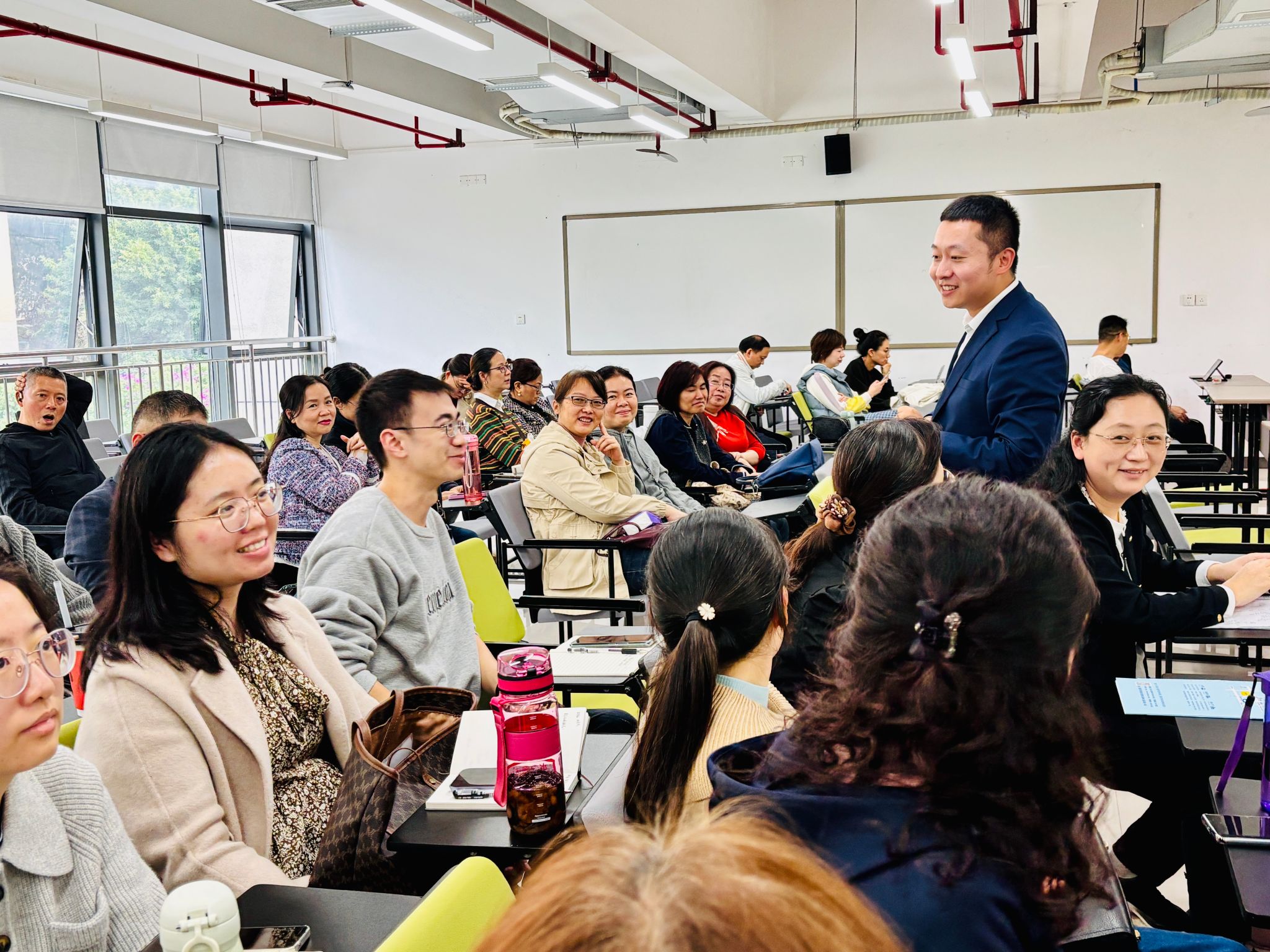 贾蕃副教授与现场老师热烈互动,询问老师们在平时工作中遇到的难题,他结合老师现场提出的困惑,详细阐述了智慧教学在外语教学中的应用。他介绍了如何利用大数据、人工智能等先进技术,实现教学内容的精准推送、学习过程的智能监控以及学习效果的即时反馈。这些技术不仅提高了教学效率,还极大地激发了学生的学习兴趣和积极性。