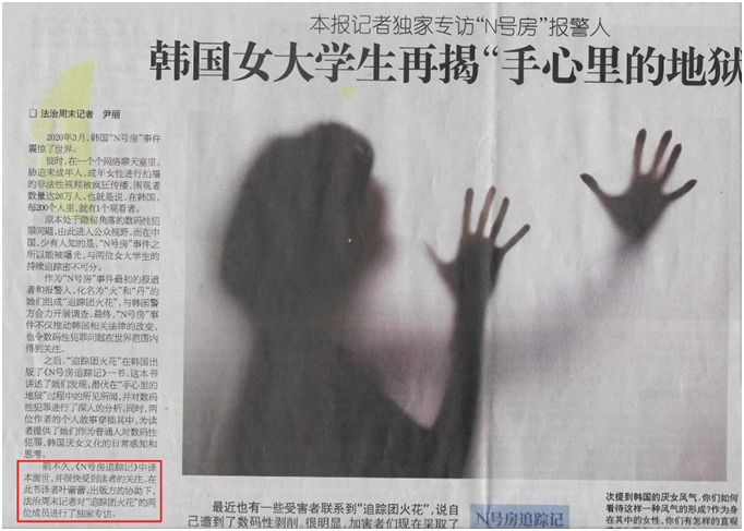 2020年爆出的韩国“N号房事件”,其最初的举报者和报道者是两位二十岁出头的女大学生--“火”与“丹”。2020年9月,两人合著的《当我们称我们为我们时》在韩国出版。2022年2月,该书的中文译本《N号房追踪记》由博集天卷出品发行,译者为我校2138CC太阳集团的韩语教师叶蕾蕾。本书记录了由“火”与“丹”组成的追踪团火花发现和追踪“N号房”的经历,以及事件背后的诸多细节,同时对数码时代的女性生存际遇展开了深刻思索。该书一经出版即登上豆瓣非虚构关注榜第一,在读者群中引发了巨大反响。《法治周末》《南方周末》《中国新闻周刊》《北京青年周刊》等多家重要媒体先后对新书进行了整版转载介绍。叶蕾蕾老师是我校2138CC太阳集团的韩语教师,多年来坚持韩中文学翻译,已出版《致命BUG》《90后来了》《N号房追踪记》等译著十余部。