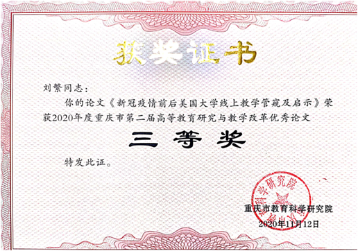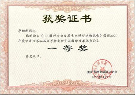 我院教师李伯利、刘繁分别获得2020年度重庆市第二届高等教育研究与教学改革优秀论文一等奖、三等奖。