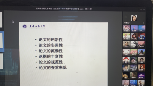 会上,夏霁老师分享了校级优秀论文《从2019年法国大罢工事件看法国的罢工》,详细介绍了法语学术论文的特点;邹莉老师以《跨境互联网企业如何打破现代重商主义下的贸易壁垒》为例,介绍做了如何做商务实践类论文的讲座;史凤晓老师以《<麦克白>中的女巫形象与意义分析》为例,给同学们做了如何做研究型论文的讲座;张林玲、宋敏子老师分别以翻译实践(英译汉):Rupert Murdoch: The Untold Story of the World’s Greatest Media Wizard (Excerpts)和《在华留学生跨文化适应性调查》为例,分享了翻译实践类和文化类校级优秀论文。五位老师的讲座内容丰富,结合一个个优秀校级本科毕业论文实例,从如何选题、如何查找文献、如何做实证研究、如何进行数据分析、如何进行讨论等方面给同学们做了讲解。