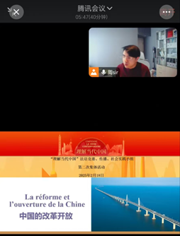 2月18日下午,小组通过腾讯线上会议平台举行了第二次活动。组长熊师慧首先介绍了活动的目的与预期目标/随后,成员们共同观看了纪录片《我们一起走过》,感受中国人民用双手书写的辉煌发展史。周渝主任用法语深入讲解了中国改革开放的历程,从经济特区的崛起到市场经济的繁荣,细致分析了相关专有名词的法语表达,鼓励同学们用法语讲述中国故事,深化了大家对改革开放的理解。