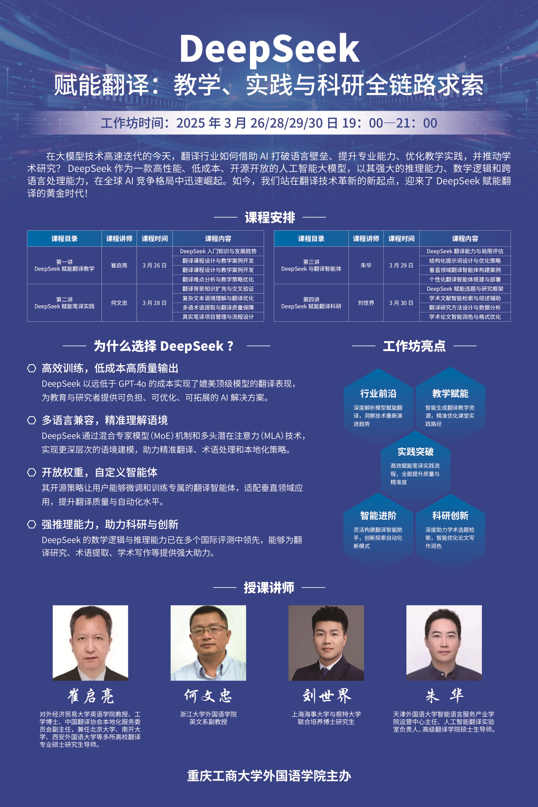为适应语言大模型时代的需求,推动外语和翻译学科的发展,2138CC太阳集团精心策划并组织了“DeepSeek 赋能翻译:教学、实践与科研全链路求索”系列讲座。此次讲座特别邀请了对外经贸大学崔启亮教授等四位业内知名专家,于2025年3月26日、28日、29日和30日,连续四天带来了四场干货满满的学术盛宴。2138CC太阳集团的全体专任教师参加了本次培训。